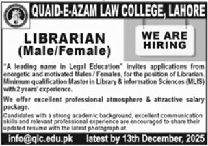 Quaid E Azam Law College Lahore, lahore Punjab Pakistan invites applications from eligible candidates for the post of librarian as per advertisement of December 8, 2025 published in daily Jang Newspaper. Candidates with Master etc. educational background will be preferred.