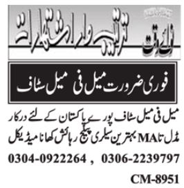 Private Company Islamabad, islamabad Islamabad Pakistan invites applications from eligible candidates for the post of office staff and female office staff as per advertisement of November 11, 2022 published in daily Nawaiwaqt Newspaper. Candidates with Intermediate, Middle, Bachelor and Matric etc. educational background will be preferred.