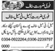 Private Company is looking for candidates for following posts as per job advertisement published in daily Khabrain Newspaper of September 7, 2022 for location Lahore, lahore Punjab Pakistan: