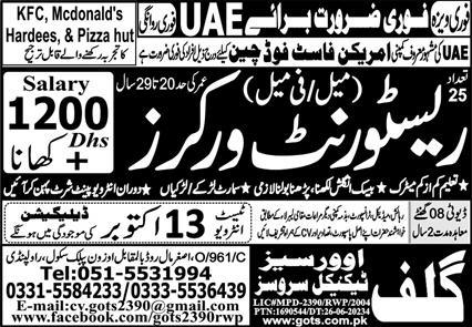 Gulf Overseas Technical Services jobs advertisement dated about 12 October 2023 in daily Express Newspaper invites application for the vacant post of female restaurant worker and restaurant worker in Abu Dhabi, sharjah UAE. Candidates with Intermediate and Matric etc. educational background will be preferred.