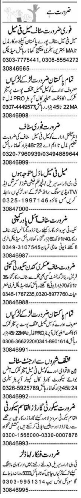 Private jobs advertisement dated about 27 March 2023 in daily Express Newspaper invites application for the vacant post of male female staff, security guard, field staff, security supervisor, model, clerk, retired staff, office staff, office boy, accountant, manager, call operator, actor, retired government staff, call computer operator, management staff, helper and pro in Multan, multan Punjab Pakistan. Persons with Matric, Bachelor, Intermediate, Middle and Master etc. education can apply.