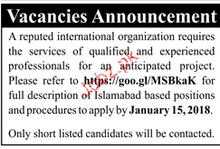 Male / Female Staff are required in A Reputed International Organization in Islamabad. Last date for Submission of application is 15 January 2018. Only Short Listed Candidate will be called for interview.