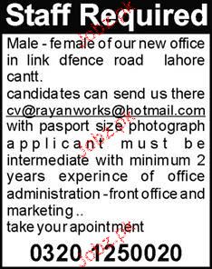 Male / Female Staff required in Lahore
