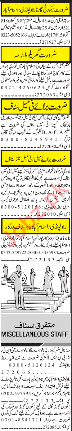 Computer Operator, Call Operator, Customer Relationship Officer CRO, Assistant Manager, Branch Manager, Receptionist, HR Officer, Supervisor, Assistant Supervisor, Account Manager, Office Assistant, Receptionist, Clerk, Naib Qasid, Watchman, Sanitary Worker, Security Guard and LTV Driver required in well reputed companies.