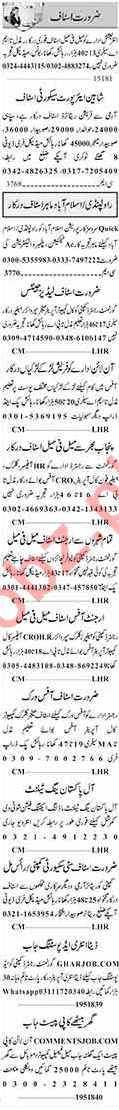 Male/ Female Executives, Salesman, Female Marketing Staff, Sales Staff, Computer Operator, Sales Manager, Customer Relationship Officer CRO, Assistant Manager, Branch Manager, Receptionist, HR Officer, Supervisor, Assistant Supervisor, Account Manager, Office Assistant and LTV/ HTV Driver required in well progressive companies.