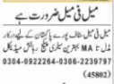 Private Company jobs advertisement dated about 25 April 2022 in daily Nawaiwaqt Newspaper invites application for the vacant post of male staff, office staff, female staff and field staff in Lahore, lahore Punjab Pakistan. Persons with Master, Middle, Intermediate, Matric and Bachelor etc. education can apply.