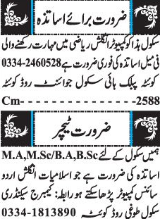 Male / Female Teachers For the Subject of English, Mathematics, Islamiat, Urdu and Computer Sciences having Minimum BA, BSc, MA / MSc with Teaching Experience are required in Quetta.