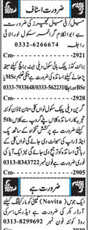 Male / Female Teachers For the Subject of Maths, Chemistry, Biology, Having BA, BSc, MA, MSc with Teaching Experience, Junior Teachers and Junior Teachers are required in Quetta.