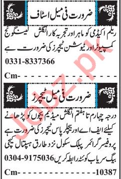 A well reputed school based in Quetta is seeking for the services from experienced candidates for the posts of Primary Teacher, Secondary Teacher, Subject Teacher (Maths, Physics, Chemistry, Biology, English, Urdu, Pak Studies & Islamic Studies), Montessori Teacher and Female Teacher.