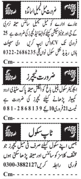Private School is looking for candidates for following posts as per job advertisement published in daily Jang Newspaper of February 18, 2022 for location Quetta Balochistan Pakistan: