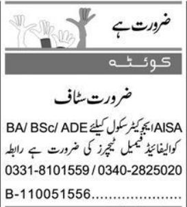 The Educators invites applications for job positions advertised in daily Express dated 8 March 2022 for following vacancies in Quetta, quetta Balochistan Pakistan.