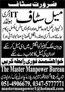 Vacant posts including it degree holder and male staff are announced in The Master Manpower Bureau Rawalpindi, rawalpindi Punjab Pakistan as per 31 December 2023 advertisement in daily Express Newspaper. Educational qualifications required BCS and BIT etc.