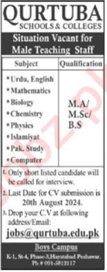 Qurtuba School & College Peshawar, peshawar Khyber Pakhtunkhwa KPK Pakistan invites applications from eligible candidates for the post of male physics teacher, male biology teacher, male pak study teacher, male computer teacher, male urdu teacher, male chemistry teacher, male english teacher, male mathematics teacher and male islamiat teacher as per advertisement of August 19, 2024 published in daily Mashriq Newspaper. Preferred Education is M.sc and MA etc.