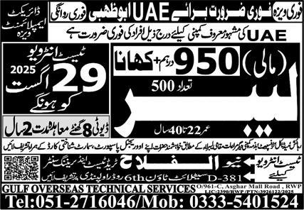 New Al Falah Trade Test & Training Center invites applications for job positions advertised in daily Express dated 28 August 2025 for following vacancies in Abu Dhabi, dubai UAE.