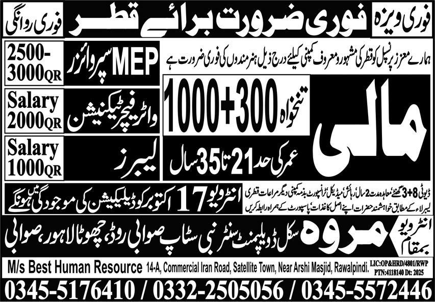 Marwa Skill Development Center invites applications for job positions advertised in daily Express dated 17 October 2025 for following vacancies in Doha, doha Qatar.
