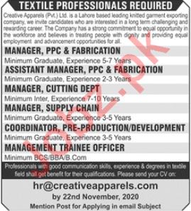 Creative Apparels Private Limited is looking for Manager PPC, Manager Fabrication, Assistant Manage PPC, Assistant Manager Fabrication, Manager Cutting , Supply Chain Manager, Coordinator, Pre Production Officer, Development Officer, Management Trainee Officer in Lahore.