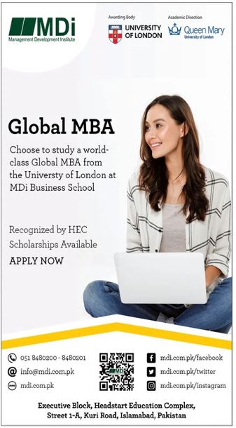 Management Development Institute MDI is an educational institution in Islamabad invites application for admission in Global Master of Business Administration MBA. Read newspaper ad for exact details.