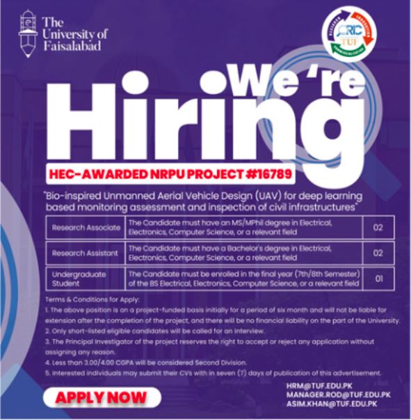 Vacant posts including research assistant, research associate and undergraduate student are announced in The University of Faisalabad University Town Faisalabad, faisalabad Punjab Pakistan as per 3 May 2025 aThe dvertisement in daily Roznama 92 News Newspaper. Preferred Education is MS, Bachelor, Phd, Mphil and Master etc.