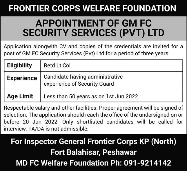 Frontier Corps Welfare Foundation Peshawar, peshawar Khyber Pakhtunkhwa KPK Pakistan invites applications from eligible candidates for the post of general manager gm as per advertisement of June 5, 2022 published in daily Express Newspaper. Persons with Master and Bachelor etc. education can apply.