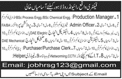 A private well reputed company is looking for experienced and energetic candidates for the posts of Production Manager, Admin Officer, Electric Incharge, Production Supervisor, Chemical Engineer, Electrician, Mechanical Engineer, Purchaser, Purchase Clerk, Helper, in Lahore. Interested candidates can contact on given details for more information.
