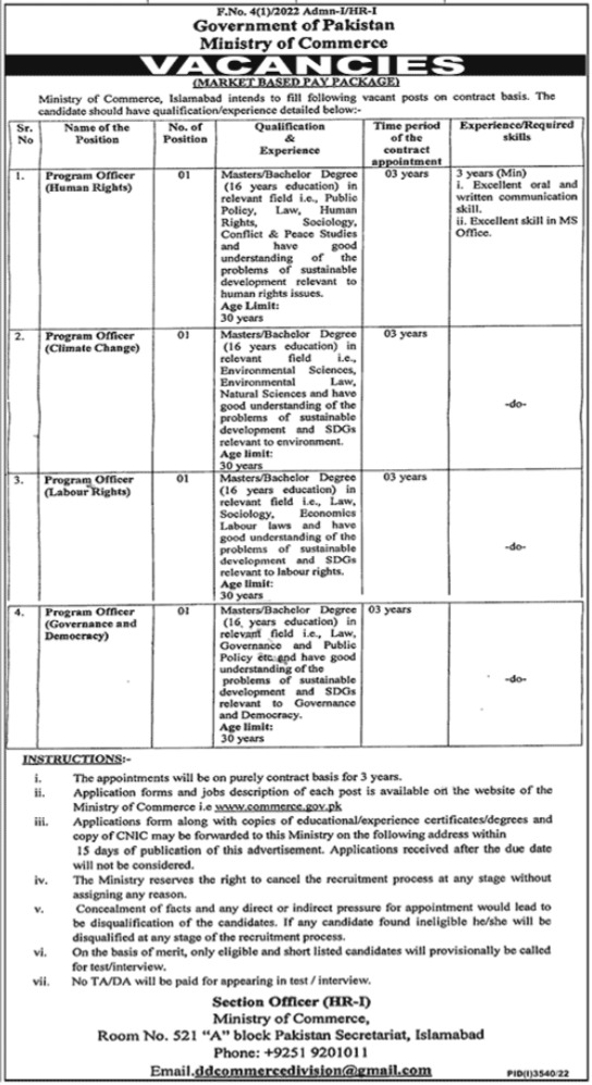 Ministry of Commerce Islamabad, islamabad Islamabad Pakistan invites applications from eligible candidates for the post of program officer human right, program officer governance democracy, program officer climcate change and program officer labour right as per advertisement of December 6, 2022 published in daily Jang Newspaper. Preferred Education is Bachelor and Master etc.