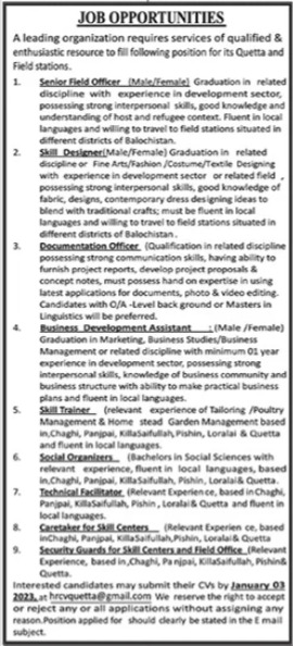 Private Company is looking for candidates for following posts as per job advertisement published in daily Jang Newspaper of December 29, 2022 for location Quetta, killa saifullah, loralai, pishin, chaghi and quetta Balochistan Pakistan: