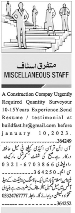 Private Company invites applications for job positions advertised in daily Jang dated 28 December 2022 for following vacancies in Islamabad, islamabad Islamabad Pakistan.