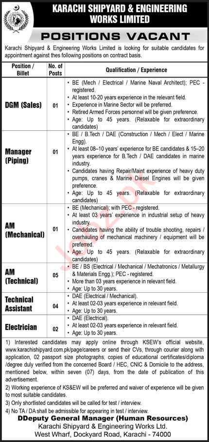 Karachi Shipyard and Engineering Works Limited Karachi, karachi Sindh Pakistan invites applications from eligible candidates for the post of electrician, am technical, manager piping, technical assistant, dgm sales and am mechanical as per advertisement of February 16, 2025 published in daily Express Newspaper. Persons with DAE and B.E etc. education can apply.