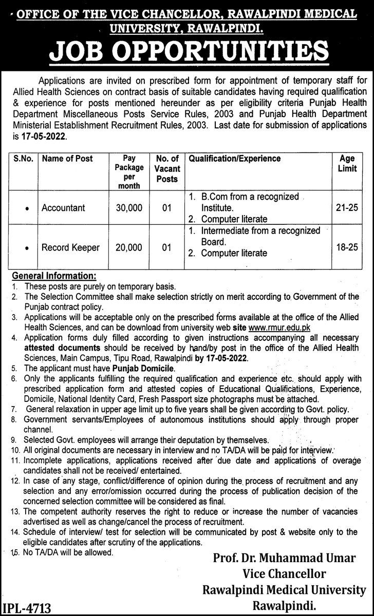 Vacancies in Rawalpindi Medical University RMU Advertisement May 2022