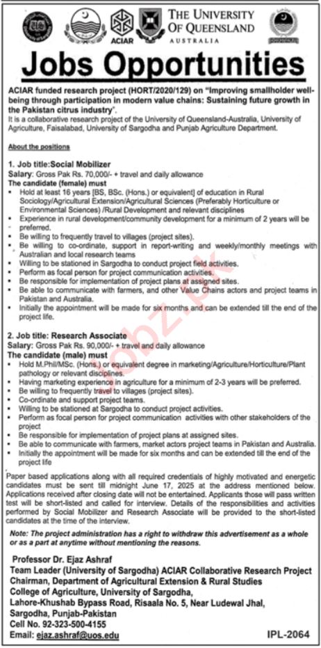University of Sargodha UOS Sargodha Bypass Sargodha, sargodha Punjab Pakistan invites applications from eligible candidates for the post of research associate and social mobilizer as per advertisement of May 25, 2025 published in daily Jang Newspaper. Bachelor and Master etc. educational qualification will be preferred.
