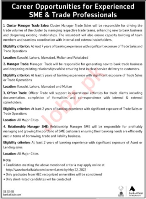 Apply at Bank Alfalah latest Private jobs in Bank and departments before closing date which is around May 22, 2022 or as per closing date in newspaper ad. Read complete ad online to know how to apply on latest Bank Alfalah job opportunities.