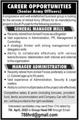 Business Group invites applications for job positions advertised in daily Jang dated 27 March 2022 for following vacancies in Multan, multan Punjab Pakistan.