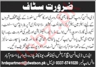 Vacant posts including electrician, admin assistant, sales girls, cashier, office boy, deo, sweeper, security guard, driver, plumber, salesman, accountant and data entry operator are announced in D Watson Blue Area Islamabad, islamabad Islamabad Pakistan as per 23 June 2025 advertisement in daily Jang Newspaper. Persons with Bachelor, Middle, Master, Matric and Intermediate etc. education can apply.