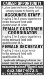 Damas Multinational Company Lahore, lahore Punjab Pakistan invites applications from eligible candidates for the post of female secretary, accounts officer and female customer coordinator as per advertisement of December 11, 2022 published in daily Jang Newspaper. Educational qualifications required Bachelor and Master etc.