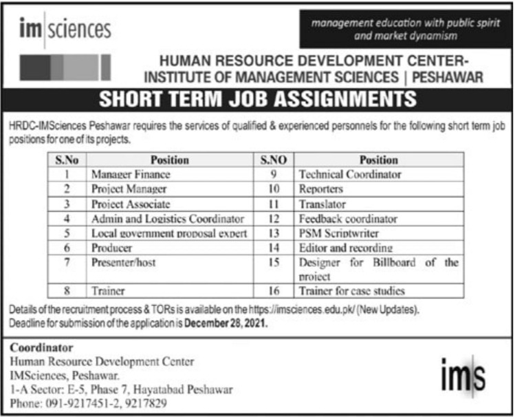 Human Resource Development Center HRDC, Institute of Management Sciences invites applications from highly educated expert and experienced professionals for the post of Manager Finance, Project Manager, Project Associate, Admin and Logistics Coordinator, Local Government proposal Expert, Producer, Presenter, Host, Trainer, Technical Coordinator, Reporter, Translator, Feedback Coordinator, PSM Scriptwriter, Editor, Designer, Trainer for Case Studies in Peshawar.
