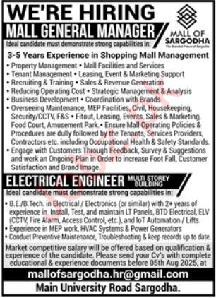 Mall Of Sargodha University Road Sargodha, sargodha Punjab Pakistan invites applications from eligible candidates for the post of mall general manager and electrical engineer as per advertisement of July 27, 2025 published in daily Jang Newspaper. Persons with Bachelor and Master etc. education can apply.