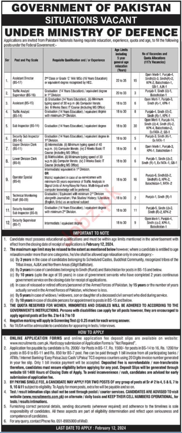 Ministry of Defence invites applications for job positions advertised in daily Ausaf dated 28 January 2024 for following vacancies in Rawalpindi, rawalpindi Punjab Pakistan.
