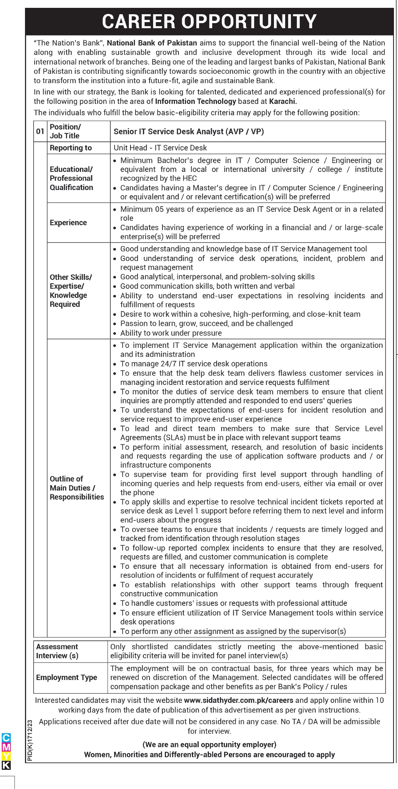 National Bank of Pakistan NBP Karachi, karachi Sindh Pakistan invites applications from eligible candidates for the post of it service desk analyst as per advertisement of December 10, 2023 published in daily Express Tribune Newspaper. Educational qualifications required Bachelor and Master etc.