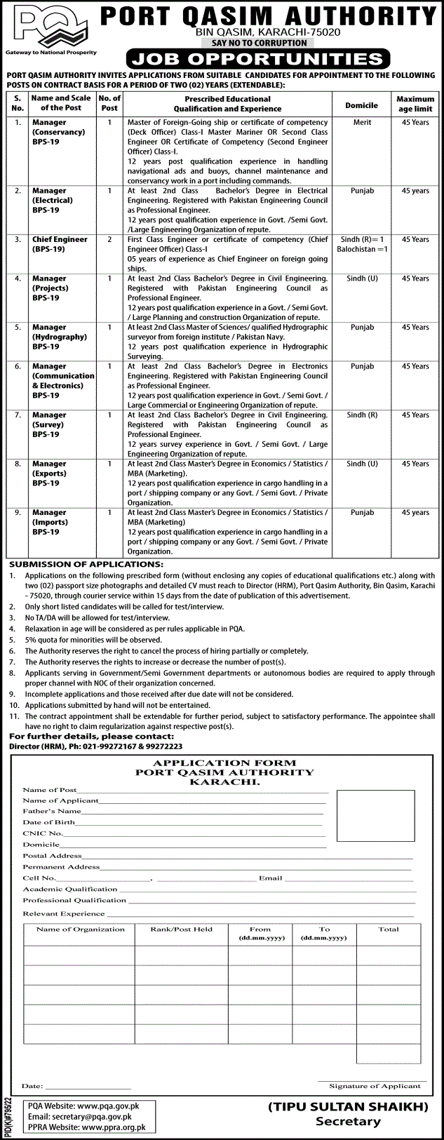 Port Qasim Authority PQA Karachi, karachi Sindh Pakistan invites applications from eligible candidates for the post of manager hydrography, manager conservancy, manager exports, manager communication, manager imports, manager electrical, manager survey, chief engineer, manager project and manager electronics as per advertisement of September 29, 2022 published in daily Ausaf Newspaper. Educational qualifications required Bachelor, LLb and Master etc.