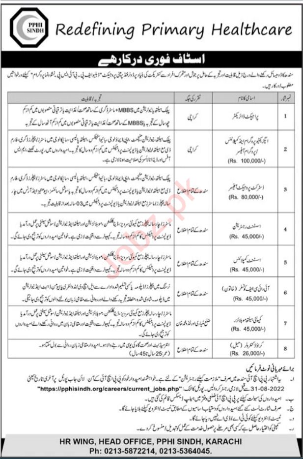 PPHI Sindh jobs advertisement dated about 18 August 2022 in daily Jang Newspaper invites application for the vacant post of executive program compliance, program officer, assistant compliance, community health mobilizer, iycf counselor, ground controller, district project officer, project director and assistant registration in Karachi, karachi Sindh Pakistan. Educational qualifications required Bachelor, Intermediate, Master and MBBS etc.