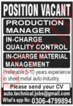Vacant posts including incharge material management, production manager and incharge qulity control are announced in Private Company Lahore, lahore Punjab Pakistan as per 13 July 2025 advertisement in daily Jang Newspaper. Candidates with Master and Bachelor etc. educational background will be preferred.