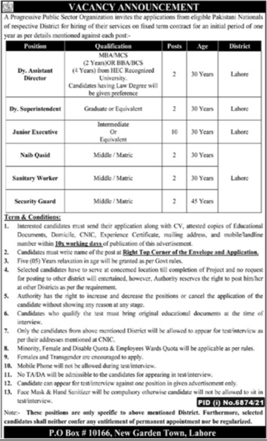 Public Sector Organization Lahore, lahore Punjab Pakistan invites applications from eligible candidates for the post of sanitary wroker, naib qasid, deputy superintendent, deputy assistant director, security guard and executive as per advertisement of March 31, 2022 published in daily Khabrain Newspaper. Educational qualifications required MCS, MBA, Middle, Matric, Bachelor and Intermediate etc.
