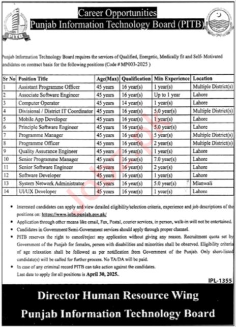 Punjab Information Technology Board PITB Ferozepur City Lahore, lahore Punjab Pakistan invites applications from eligible candidates for the post of Office Assistant, Graphic Designer, Programme Officer, Principal Software Engineer, Front End Developer, Mobile App Developer, Project Director, Programme Manager, Quality Assurance Engineer, Librarian, Deo, Data Processor, Business Analyst, Resident Engineer, Data Analyst, Technical Content Writer, Security Guard, Assistant Programme Officer, Software Engineer, Project Assistant and Database Administrator as per advertisement of April 13, 2025 published in daily Jang Newspaper. Bachelor and Master etc. educational qualification will be preferred.