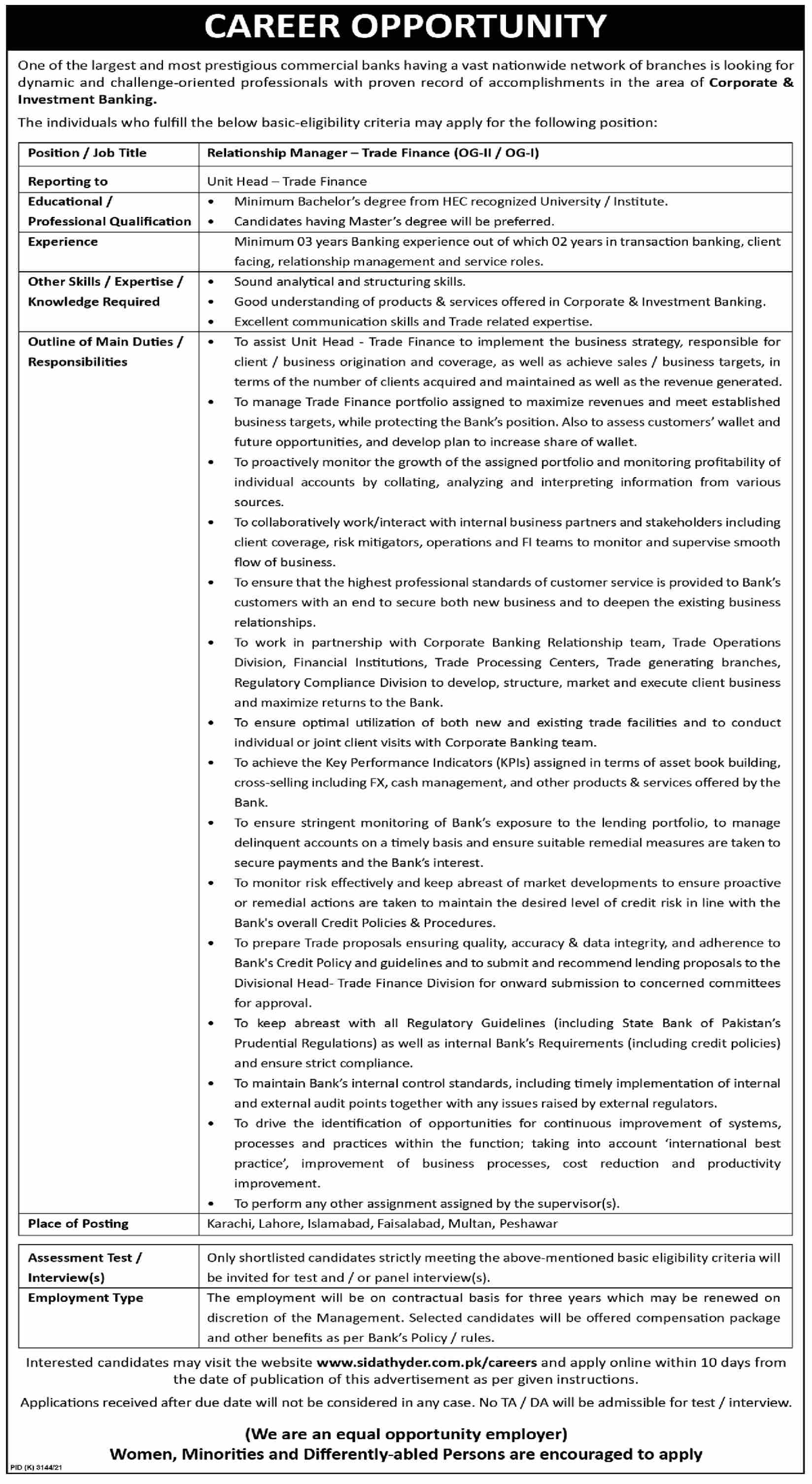 Sidat Hyder Morshed Associates Islamabad, multan, islamabad, lahore, peshawar, faisalabad and karachi Islamabad Pakistan invites applications from eligible candidates for the post of trade finance officer and unit head as per advertisement of April 25, 2022 published in daily Dawn Newspaper. Candidates with Bachelor and Master etc. educational background will be preferred.
