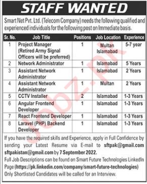 Smart Net Private Limited is looking for candidates for following posts as per job advertisement published in daily The News Newspaper of August 28, 2022 for location Islamabad, islamabad and multan Islamabad Pakistan: