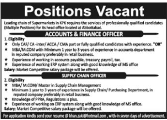 Super Market is looking for candidates for following posts as per job advertisement published in daily Aaj Newspaper of April 30, 2022 for location Abbottabad, abbottabad Khyber Pakhtunkhwa KPK Pakistan: