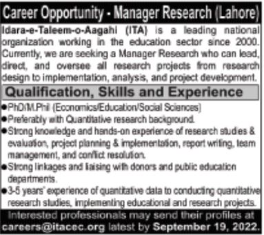 Latest Management jobs and others Private jobs in Idara e Taleem o Aagahi closing date is around September 19, 2022, see exact from ad. Read complete ad online to know how to apply on latest Idara e Taleem o Aagahi job opportunities.