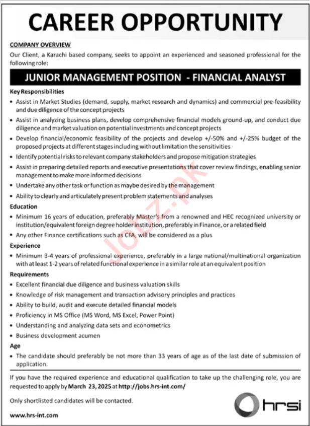 Vacant posts including jr management position financial analyst are announced in Human Resource Solution International HRSI Clifton Karachi, karachi Sindh Pakistan as per 9 March 2025 advertisement in daily Jang Newspaper. Educational qualifications required Bachelor and Master etc.