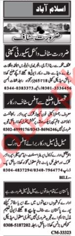 A private well known and well established company is seeking services of hardworking and experienced candidates for the posts of Security Guard, Sales Executive, Sales Assistant, Helper, Manager, Supervisor, Admin, Assistant, Computer Operator, Phone Operator, Clerk in Islamabad. Interested candidates can contact for more details.