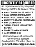 An reputable company required the services of highly qualified and experienced candidates for the posts of Call Center Sales Agent, Call Center Supervisor, Creative Content Writer, Creative Graphic Designer, PHP Developer, Social Media Marketing Expert, Marketing Manager and Office Boy in Karachi.